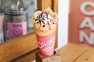 スイーツ系からお食事系のクレープを揃えるクレープ専門店。もう1つの看板商品は6つの味が楽しめるコットンキャンディ。