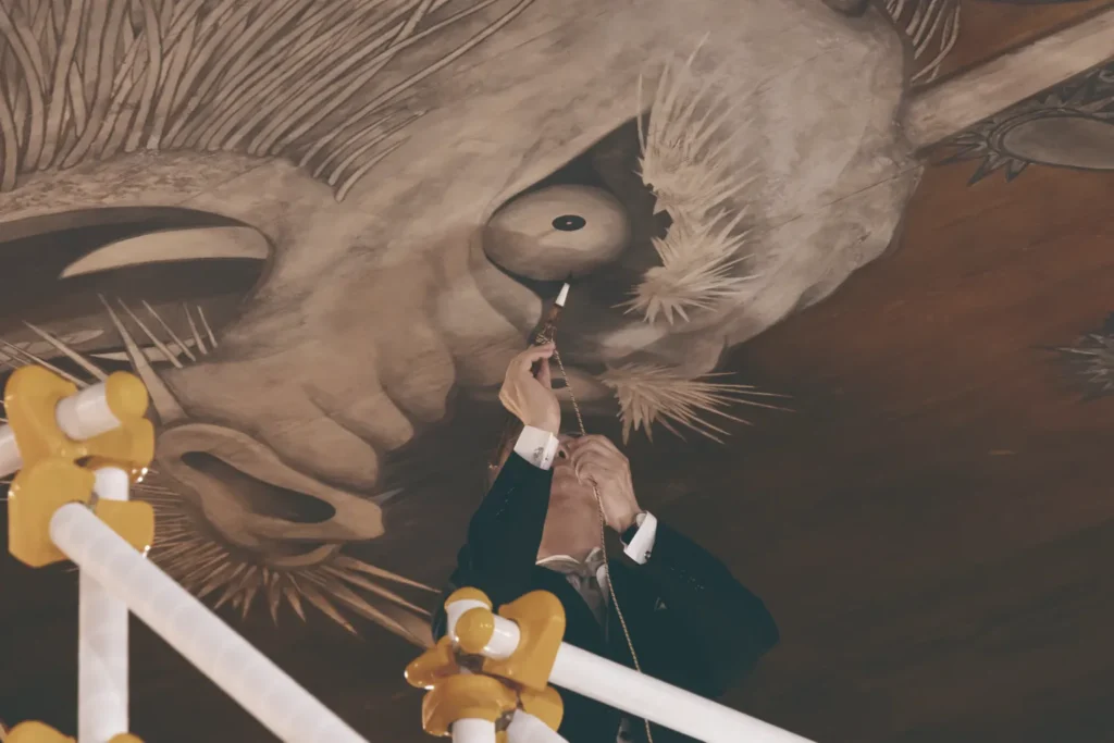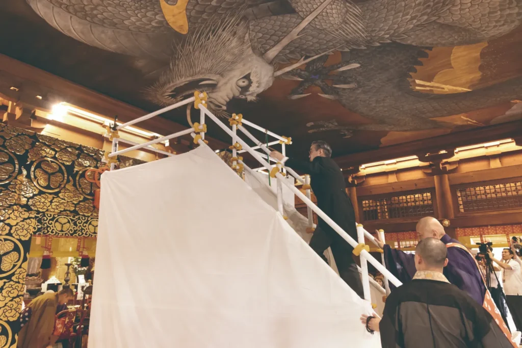 2025年に創建400周年を迎えるにあたり、東京藝術大学名誉教授・日本画家の手塚雄二画伯が縦6メートル、横12メートルの国内最大級の天井絵を制作。この日、手塚先生が龍の目を描き入れる「画竜点睛」を行い、水上文義貫首による開眼法要を経て、2頭の龍がついに荘厳な姿を現しました。