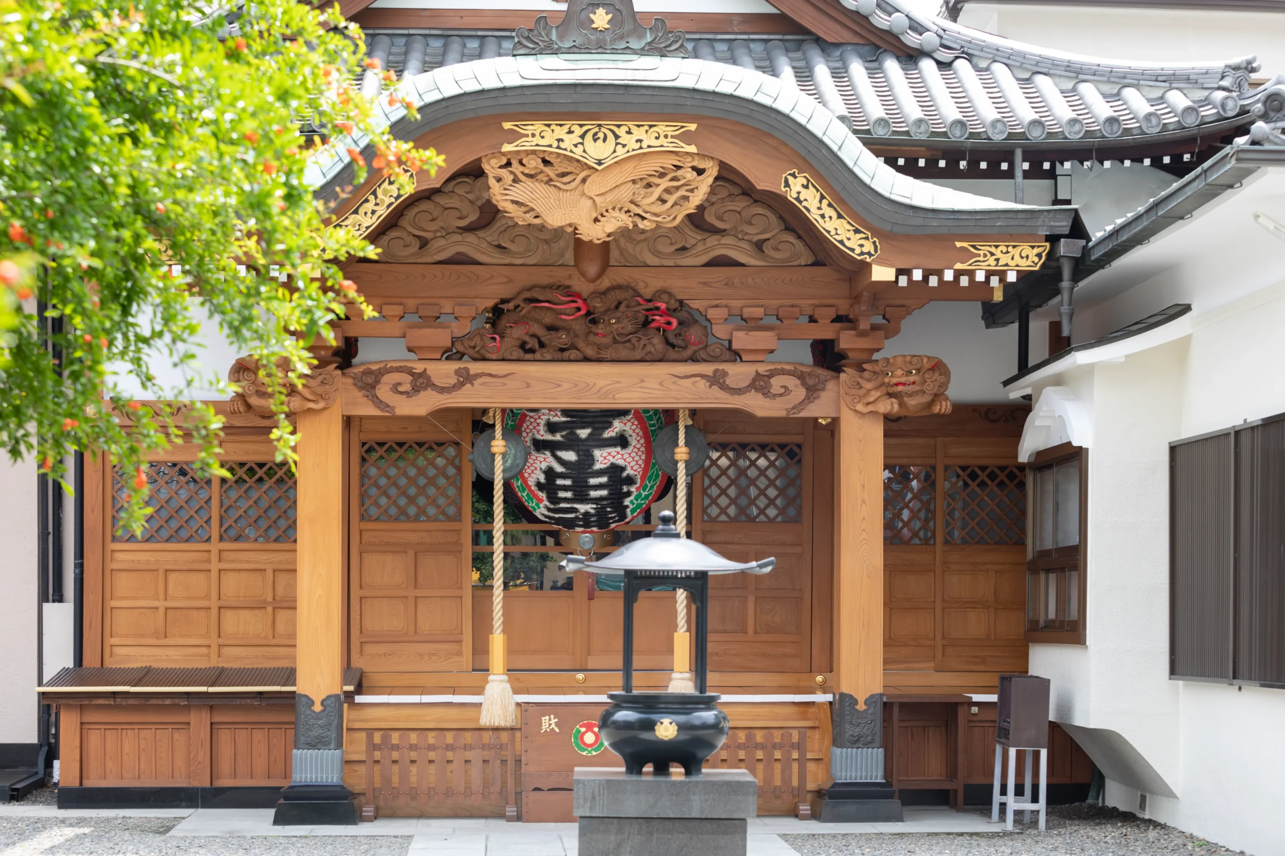 仏像彫刻で知られる日融聖人が手彫りした鬼子母神が祀られています。鬼子母神はザクロを食べる神様としても有名で、境内の瓦には「ザクロ紋」を見つけることができます。