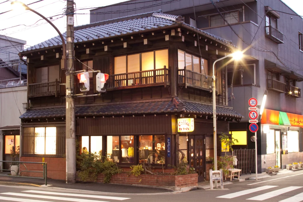 1、2階ともに出桁造りの軒をまわす姿が特徴的な町家型のこの建物は、上野公園から谷中に入るランドマークとなっています。大正5年に建設以降、ミルクホール、かき氷・あんみつ店などを経て、昭和13年に「カヤバ珈琲店」となり、幅広い層に長年親しまれてきました。平成18年にいったん閉店となったものの、この喫茶店に愛着を持つ人々の支援を得て、平成21年にたい歴が借り受け、新しい運営者により復活しました。